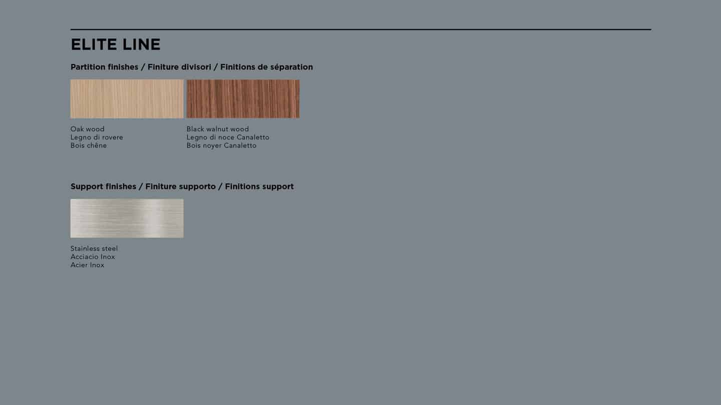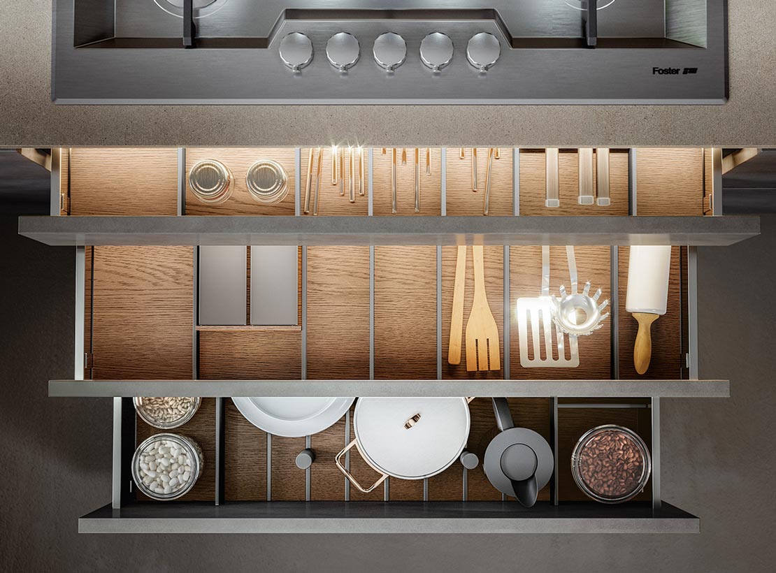 Une vaste gamme d’accessoires sont disponibles pour équiper tiroirs et casseroliers, dans plusieurs finitions allant de l’acier au noyer Canaletto massif, du frêne teinté noir à des éléments plastique aimantés.